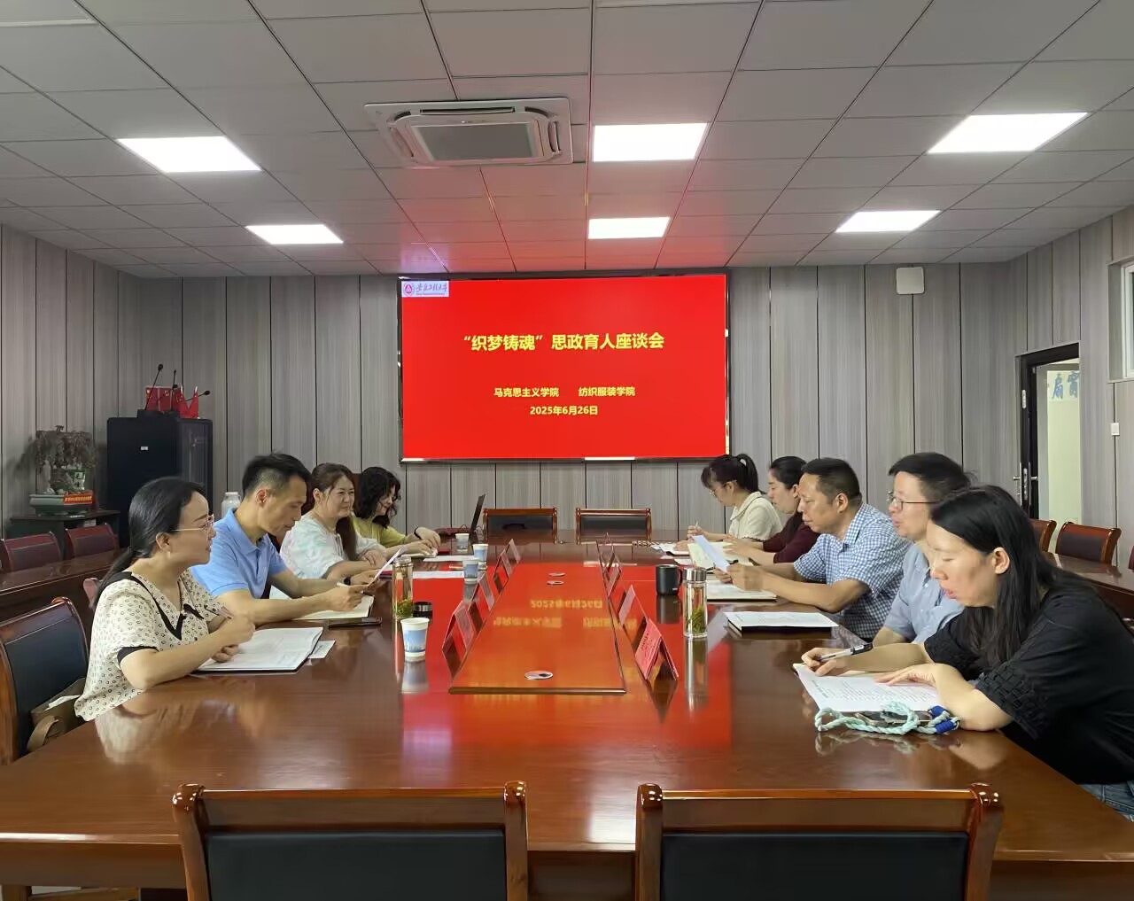 6月26日,纺织服装学院联合马克思主义学院举办“织梦铸魂”思政育人共同体建设座谈会。纺织服装学院党委书记李长龙、校党委宣传部副部长王燕、马克思主义学院副院长刘德军、纺织服装学院党委副书记梁雪松、马克思主义学院党总支副书记裴利萍、两学院教师代表和辅导员代表参会,会议由梁雪松主持。