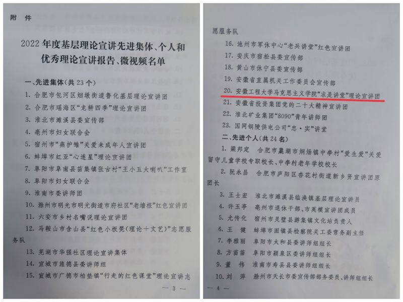 近日,省委宣传部、省委讲师团印发《关于表彰2022年度基层理论宣讲先进集体、个人和优秀理论宣讲报告、微视频的通报》,对全省23个先进集体、24名先进个人、15篇优秀理论宣讲报告和15个优秀理论宣讲微视频进行表彰。我校马克思主义学院“求是讲堂”理论宣讲团获基层理论宣讲先进集体表彰,这也是获奖集体中唯一一所高校获此殊荣。