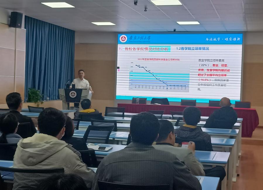 动员会上,葛飞详细对比分析了我校各学院申报、立项、立项率情况;对比分析了我院近2年国基申报及立项情况以及我院各系部申报、立项情况。同时基于2022年我院国基立项取得的成绩,分析了我院在“三三三”方案培育上的成效,并就我院下一步工作举措以及2023年度国基申报时间进度进行了布置。