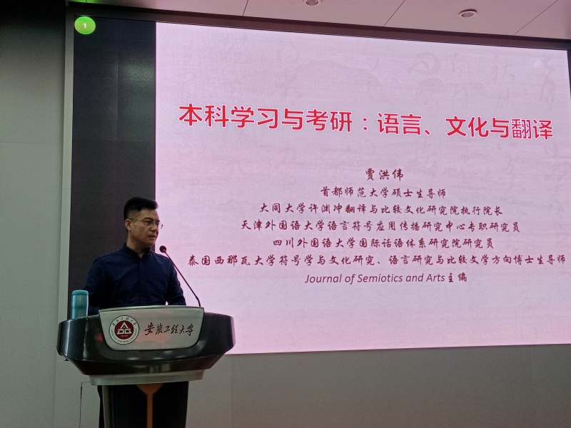 1031日下午,首都师范大学副教授、联合培养博士生导师、中国知网国际出版中心翻译质检专家贾洪伟博士应邀来校作题为“本科学习与考研:语言、文化与翻译”的学术讲座。讲座由外国语学院英语系主任李新国主持,院长黄焰结与相关专业师生聆听了此次讲座。