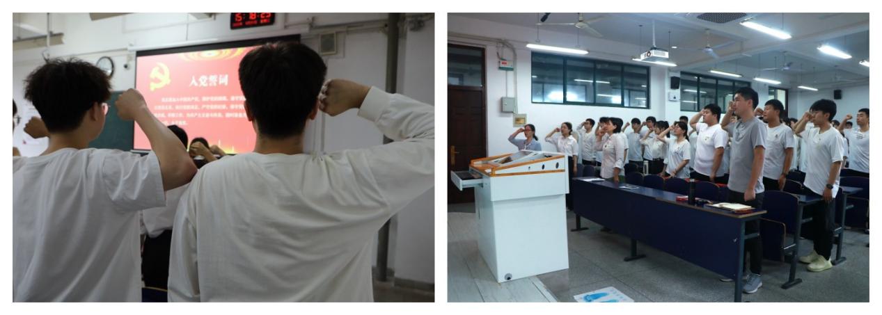为鼓励新党员赓续优秀党员的光荣传统,会上举行“老党员为新党员佩戴党员徽章”仪式,老党员张焱、袁自坤老师和4名2023届毕业生党员郑重地为新党员佩戴党员徽章,以传递党员的责任意识和担当精神,鞭策新党员坚定信仰、坚守初心,不断加强学习,在习近平新时代中国特色社会主义思想指引下奋力前行。